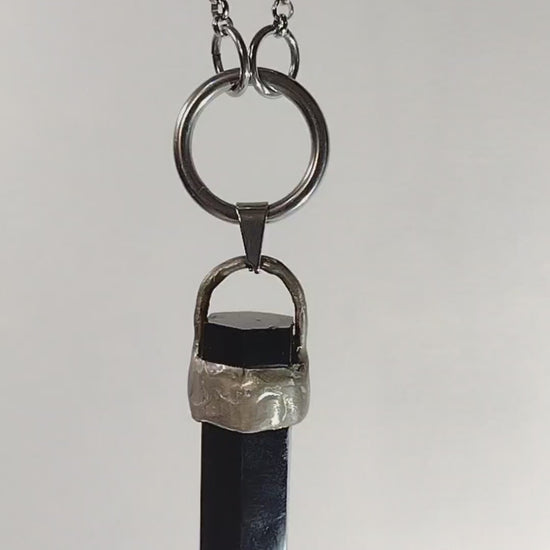 Black Obsidian Crystal Pendant with Necklace. The Crystal pendent is 3 1/2 inches long. The Ring is 1 inch. The necklace is 9 inches long and is stainless steel.