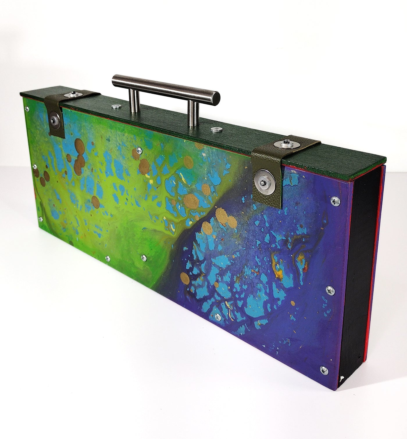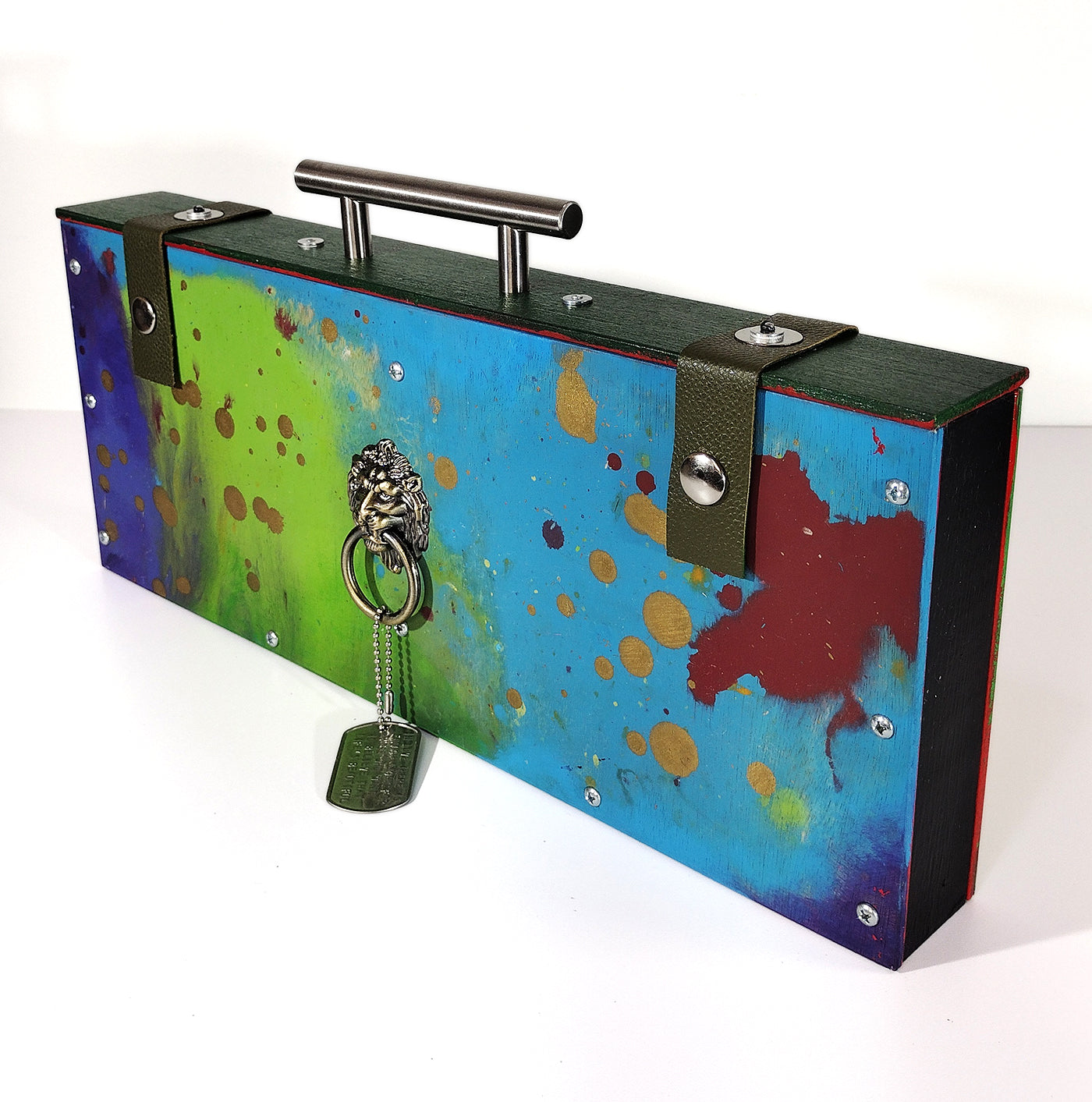 Featuring a hand-painted abstract finish, a leather closure, this bag blends creativity, strength, and modern edge. Perfect for day or night, it’s more than an accessory—it’s a statement. SIZE: L: 2" W: 15 3/4" H: 6 1/2"