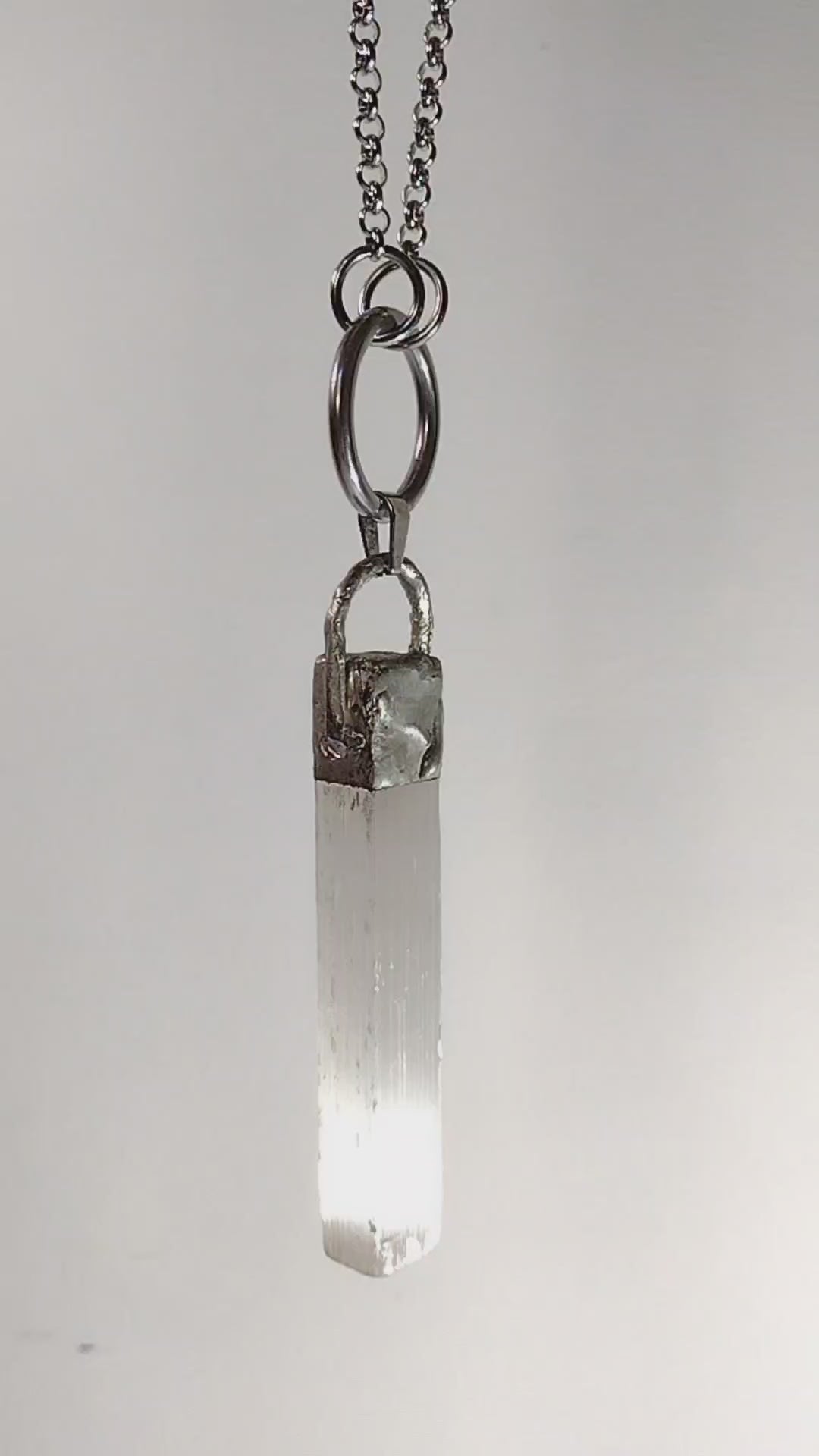 Selenite Crystal Pendant with Necklace. The Crystal pendent is 4.5 inches long. The Ring is 1 1/2 inch. The chain is 9 inches long and is stainless steal.