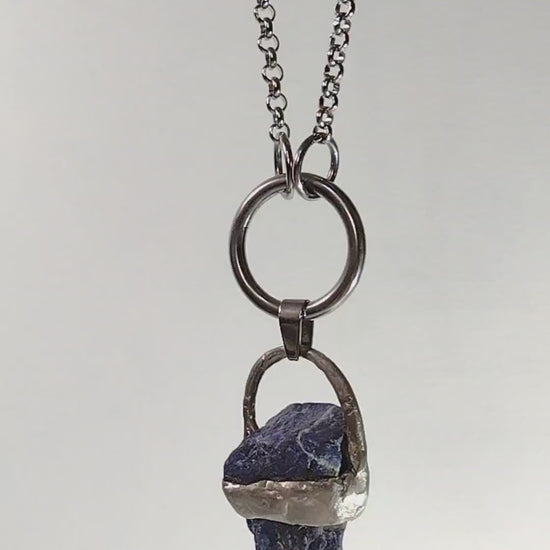 Sodalite Crystal Pendant with Necklace. The Crystal pendent is 2 1/4 inches long. The Ring is 1 1/2 inch. The chain is 9 inches long and is stainless steal.